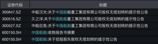 与此同时,久之洋(300516)、中船应急(300527)、中船汉光(300847)、中国重工(601989)、中国动力(600482)、中国海防(600764)等6家上市公司也发布公告称,因国务院国资委将其控股股东中船重工集团的全部股权无偿划转至中国船舶集团,导致中国船舶集团将成为公司的间接或直接控股股东。