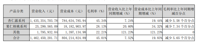 具体来看,其中杏仁露系列毛利率45.34%,同比减少5.58个百分点;果仁核桃系列同比减少7.34个百分点至28.13%;公司整体毛利率为45.01%,同比减少5.65个百分点。