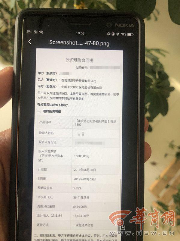 38岁的史女士是河北保定人,做生意。今年4月,朋友给她介绍了一款名为“博观财富”的App,是个投资平台,运营方为西安博观资产管理有限公司,朋友称在上面购买产品的利润很好,主要是可靠,一般情况下24小时就可以获得收益并提现,“我朋友说3月份在微信群里看到了,做了一个月,收益情况良好,才推荐给我的。”