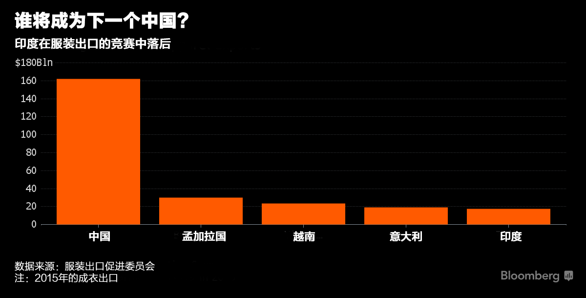 印度还面临着其他制约因素。由于仅生产纯棉服饰,印度进入冬季服装市场的能力有限,与此同时,买家还认为与中国或越南相比,印度效率较低,也不太可靠。在邻国孟加拉国,服装业占了海外出口商品的80%,月最低工资大约比印度的105美元低30%,此外,孟加拉国的出口商还不需要向欧盟国家支付关税。