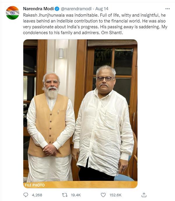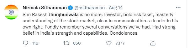 印度财政部长西塔拉曼(Nirmala Sitharaman)在推特上称,金君瓦拉是一位“投资者、大胆的冒险者、对股市的娴熟理解”,还表示他是一位“有实力的领袖”,坚信印度的实力和增长。
