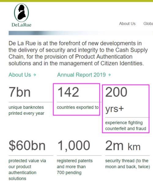 据公司官网介绍,具有200多年历史的德拉鲁公司与全球142家央行签订了印钞合同,也就是说世界上约三分之一的钞票都是这家公司印刷的。