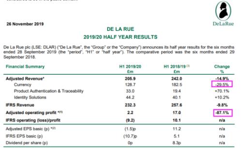 在最新公布的半年报中,德拉鲁的主营业务——印钞的营收下降了29.5%,这直接导致了该公司上半年的净利润下降了87.1%。