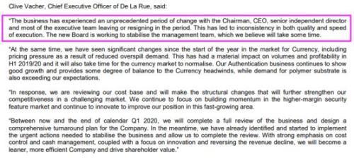 10月份刚刚上任的德拉鲁CEO Clive Vacher 坦言,今年公司的业务受到了极大的挑战,董事长、CEO、行政总监和中层骨干的相继离职,让公司一度陷入了混乱。同时,随着印钞业务需求的减少,印钞价格也承压。