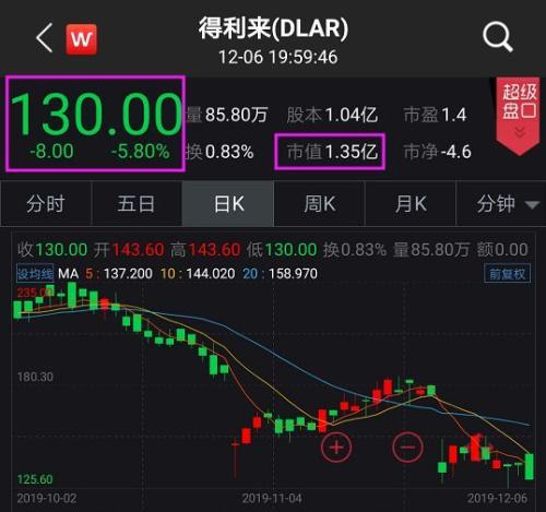 半年报公布之后,德拉鲁的股价27日,伦敦交易所开盘后,一度下挫约20%。截止到12月6日,德拉鲁的股价仅剩130英镑/股(不到高光时刻的1/10),市值仅剩1.35亿英镑,公司的债务水平已经远远超过了其总市值。