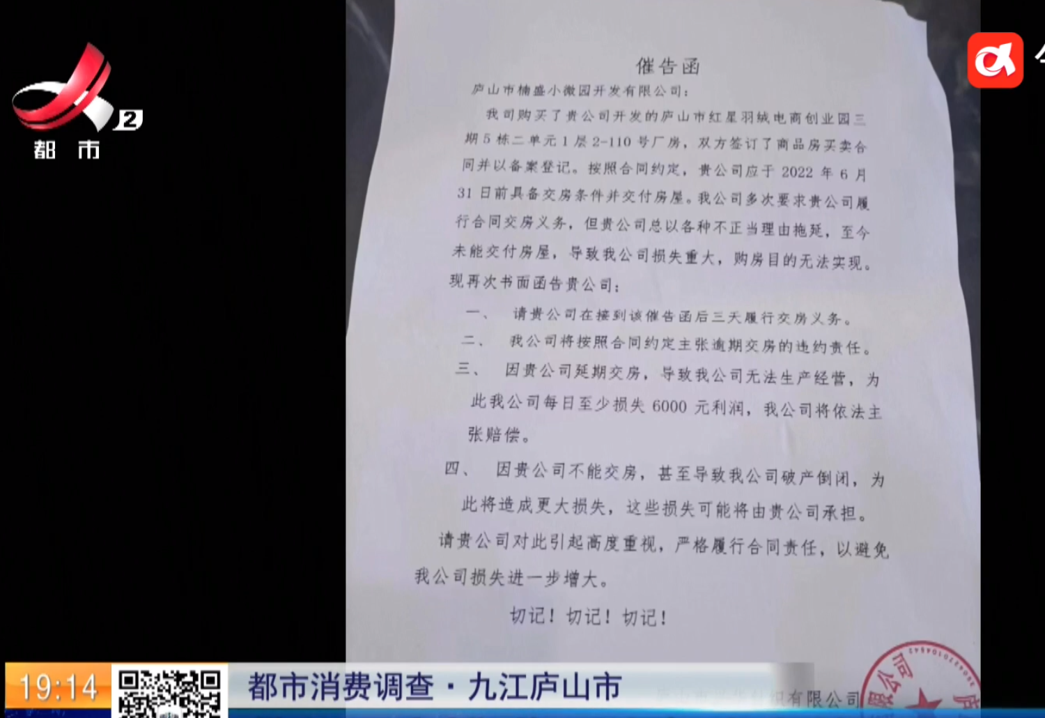 李先生是一家纺织厂的老板,去年,为了扩大经营,他在江西省九江市庐山的楠盛红星羽绒产业园买了一个厂房和一个商铺。按照合同,2022年6月30号要交付,可直到现在,商铺还是没有着落。多次协商未果,李先生给《都市现场》24小时新闻热线0791—88316800打来电话,希望我们能帮帮忙。