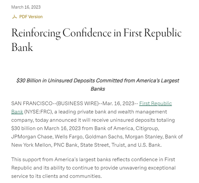 当地时间2023年3月16日,领先的私人银行和财富管理公司第一共和银行(FRC,股价34.38美元,市值64.02亿美元)宣布,将从美国银行、花旗集团、摩根大通、富国银行、高盛、摩根士丹利、纽约梅隆银行、PNC银行、道富银行、特鲁斯特银行和美国银行获得总计300亿美元的未投保存款。