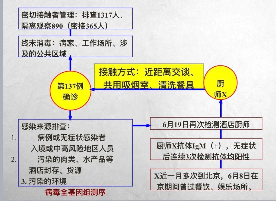 有可能厨师x在北京期间,特别是6月8日在公共场所,长时间逗留的过程当中,有可能是被感染了,感染之后,他没有症状,正常上班。在上班的过程当中,通过刚才所说的二人接触的方式,有可能传染给了第137例确诊病例。