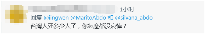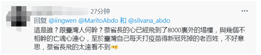 很快,网友的愤怒就来了。不少人质疑蔡英文为何不关心因疫情中失去生命的台湾人,并痛骂“天理难容”。↓