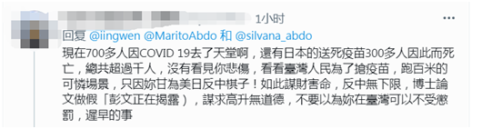“现在700多人因新冠病毒去了天堂啊,还有日本的送死疫苗300多人因此而死亡,总共超过千人,没有看见你悲伤,看看台湾人民为了抢疫苗,跑百米的可怜场景,只因你甘为美日反中棋子!如此谋财害命,反中无下限,博士论文做假,谋求高升无道德,不要以为你在台湾可以不受惩罚,迟早的事。”