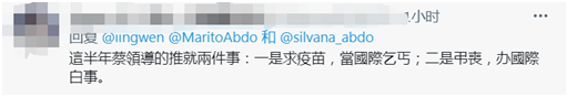 “这半年蔡领导的推(特)就两件事:一是求疫苗,当国际乞丐;二是吊丧,办国际白事。”