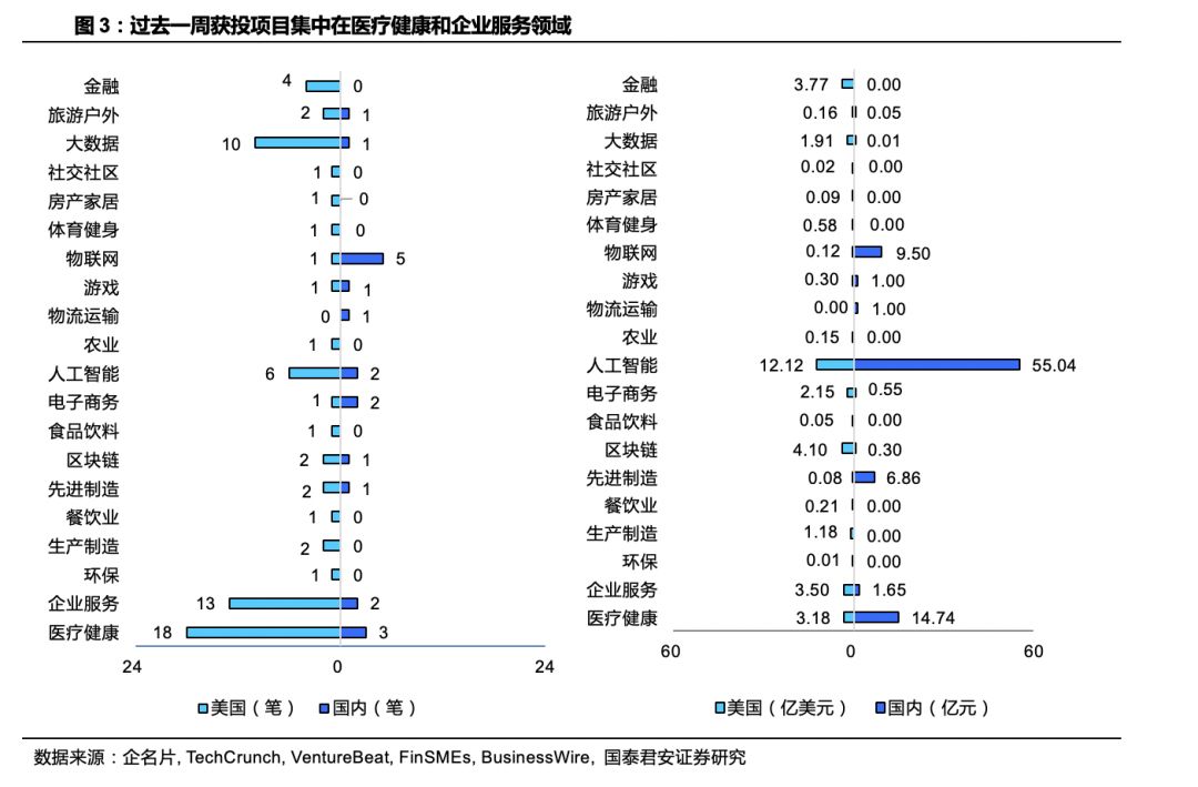 过去一周,已披露融资金额的中美两国公司分别有20家和69家,总计获得融资金额分别约为91亿元和34亿美元(约合234亿元)。从融资项目所在行业领域上看,中国主要集中在物联网(5笔)及医疗健康(3笔)等领域;美国主要集中在医疗健康(18笔)、企业服务(13笔)及大数据(10笔)等领域。