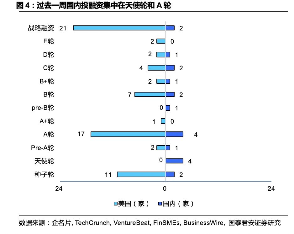 从融资轮数上看,过去一周中国获投公司中天使轮和A轮为首,种子轮、B轮、C轮和战略融资较多,美国的获投公司战略融资最多,A轮和种子轮数量较多。