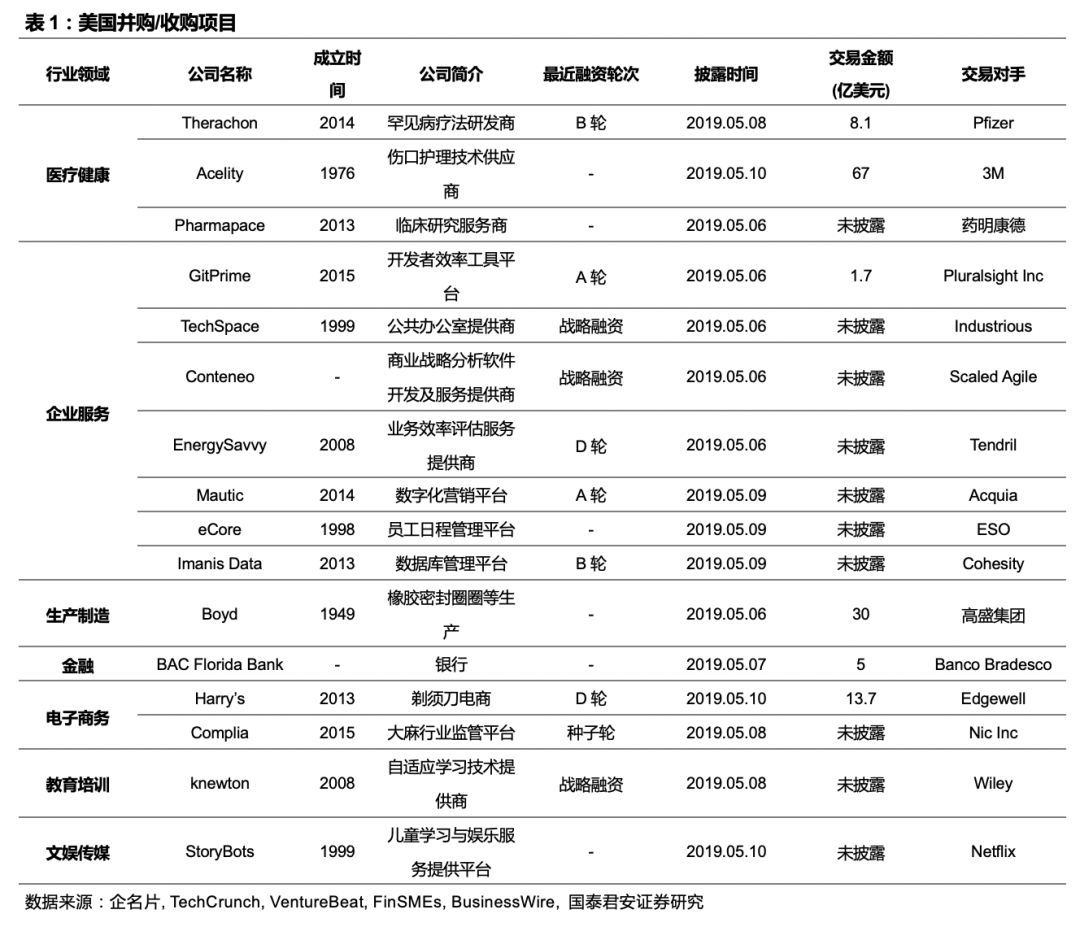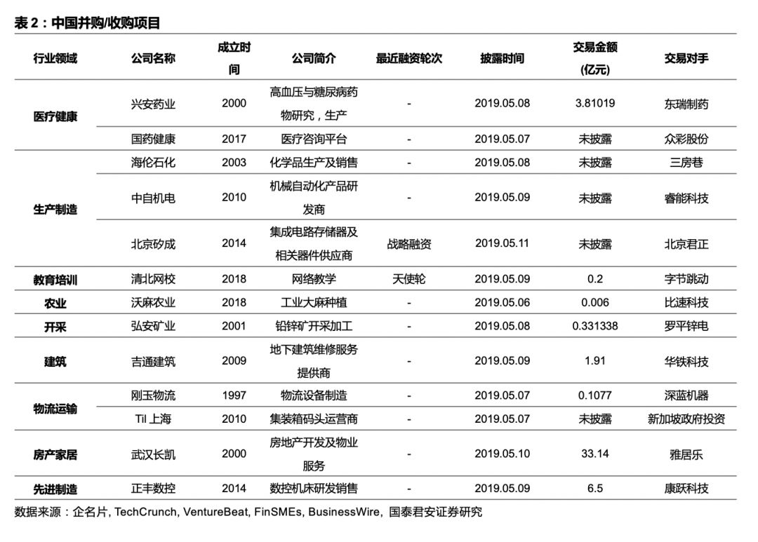 中国和美国分别有13和16家公司发生并购/收购。中美发生并购/收购数量最多的领域分别为生产制造(3笔)和企业服务(7笔)。