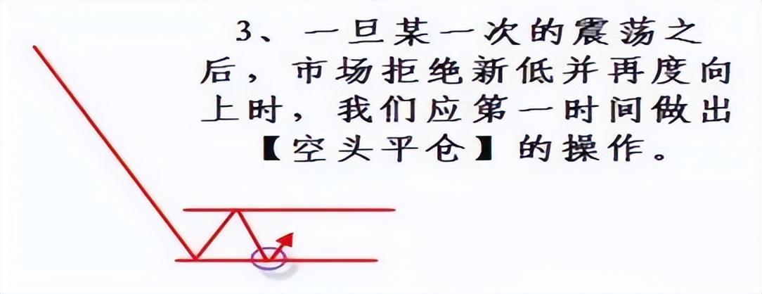 3、一旦某一次的震荡之后,市场拒绝新低并再度向上时,我们应第一时间做出【空头平仓】的操作。
