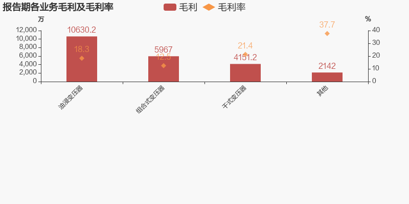从业务结构来看,“油浸变压器”是企业营业收入的主要来源。具体而言,“油浸变压器”营业收入为5.8亿元,营收占比为44.4%,毛利率为18.3%。