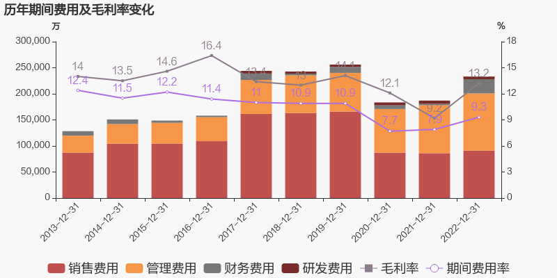 公司2022年营业成本217.01亿元,同比增长1.2%,低于营业收入5.8%的增速,导致毛利率上升3.9%。期间费用率为9.3%,较上年升高1.4%。经营性现金流大幅上升257.8%至19.79亿元。