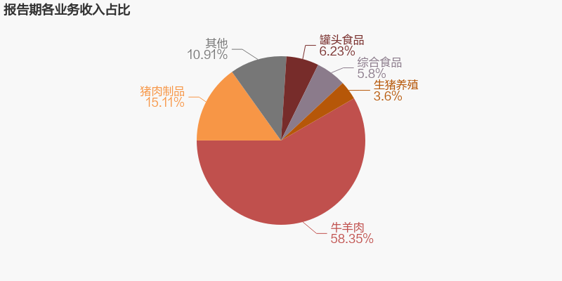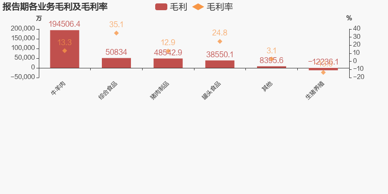 从业务结构来看,“牛羊肉”是企业营业收入的主要来源。具体而言,“牛羊肉”营业收入为145.79亿元,营收占比为58.3%,毛利率为13.3%。