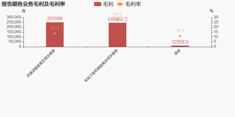 从业务结构来看,“交通运输装备及相关服务”是企业营业收入的主要来源。具体而言,“交通运输装备及相关服务”营业收入为183.5亿元,营收占比为64.4%,毛利率为13.7%。