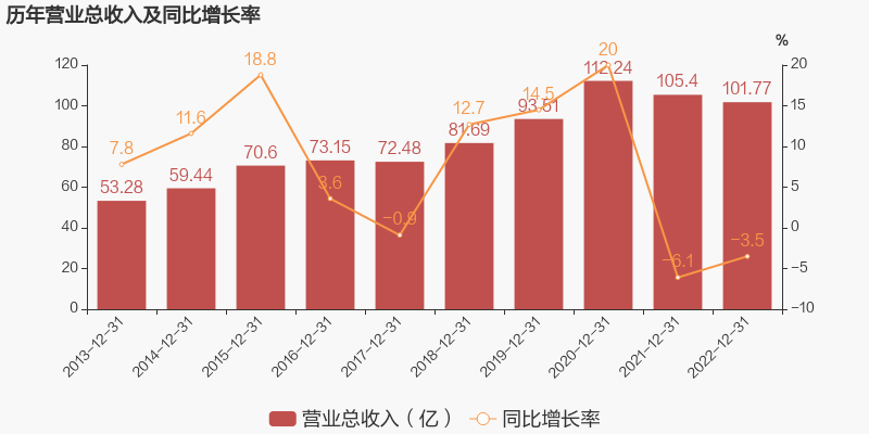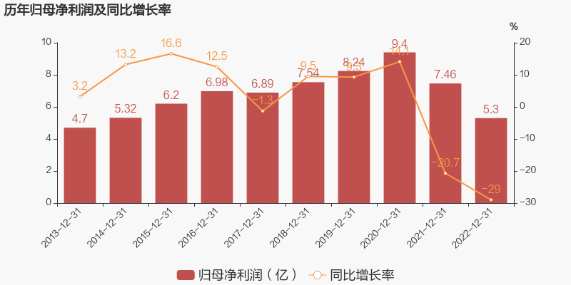 九阳股份于2023年4月1日披露年报,公司2022年实现营业总收入101.77亿元,同比下降3.5%,降幅较去年同期收窄;实现归母净利润5.3亿元,同比下降29%,降幅较去年同期扩大;每股收益为0.7元。