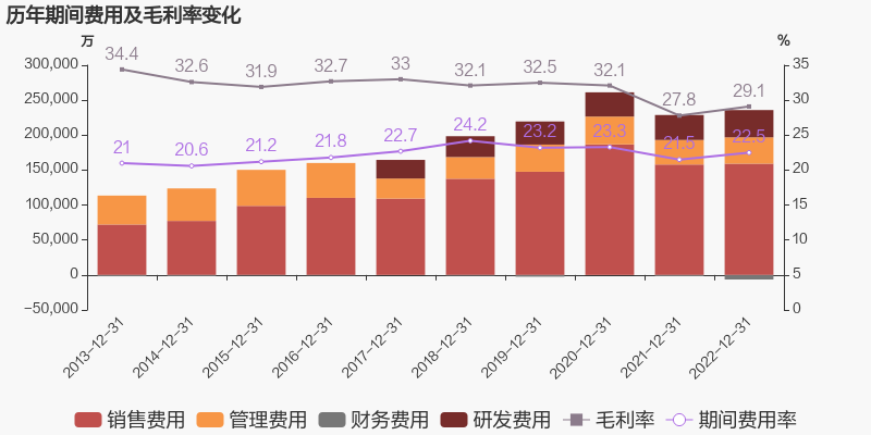 公司2022年营业成本72.17亿元,同比下降5.2%,高于营业收入3.5%的下降速度,毛利率上升1.3%。期间费用率为22.5%,较上年升高1.0个百分点。经营性现金流由-3479万元增加至6.1亿元,同比上升1854.7%。