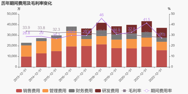 公司2022年营业成本9.77亿元,同比增长32.1%,高于营业收入30.2%的增速,导致毛利率下降1%。期间费用率为27.3%,较去年下降14.3%。经营性现金流大幅上升796.3%至1.22亿元。