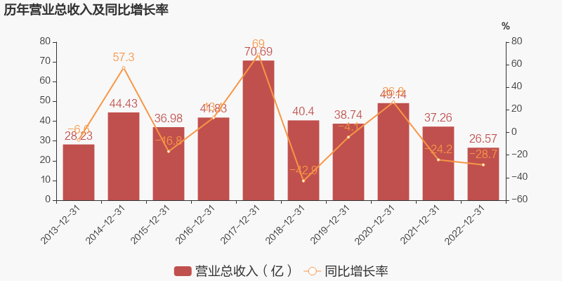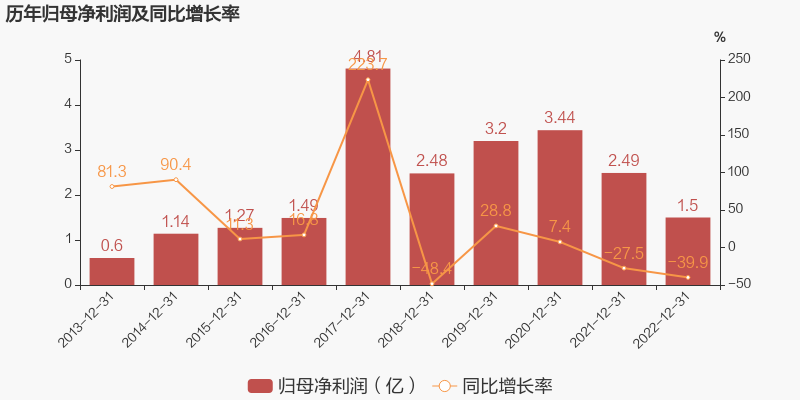 宁波联合于2023年4月11日披露年报,公司2022年实现营业总收入26.57亿元,同比下降28.7%,降幅较去年同期扩大;实现归母净利润1.5亿元,同比下降39.9%,降幅较去年同期扩大;每股收益为0.48元。
