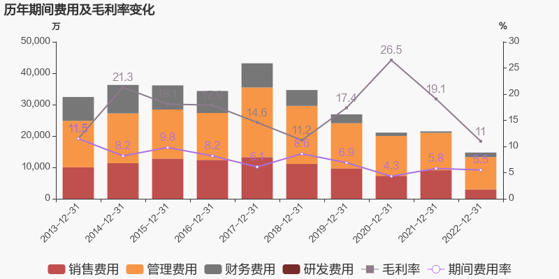 公司2022年营业成本23.65亿元,同比下降21.5%,低于营业收入28.7%的下降速度,毛利率下降8.2%。期间费用率为5.5%,同去年相比变化不大。经营性现金流大幅下降58.7%至-3.53亿元。