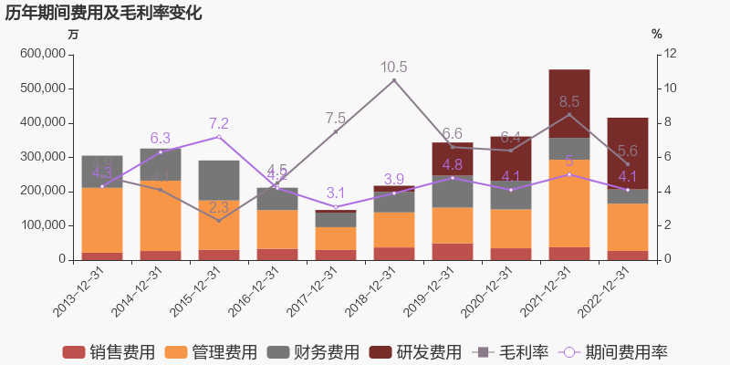 公司2022年营业成本966.04亿元,同比下降4.8%,低于营业收入7.7%的下降速度,毛利率下降2.9%。期间费用率为4.1%,较去年下降1.0个百分点。