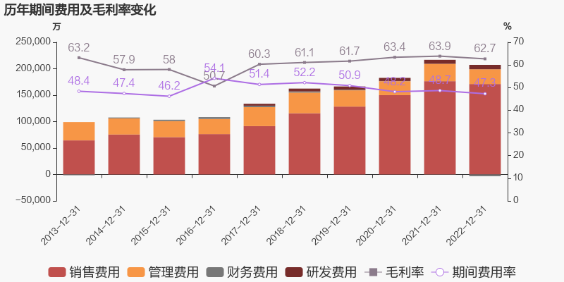 公司2022年营业成本16.07亿元,同比上升0.1%,营业收入同比下降3.1%,毛利率下降1.2%。期间费用率为47.3%,较去年下降1.4%。