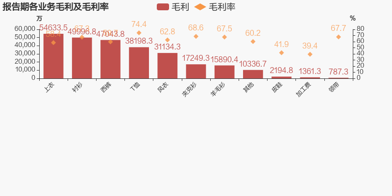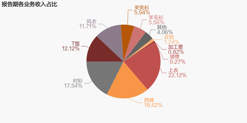 从业务结构来看,“上衣”是企业营业收入的主要来源。具体而言,“上衣”营业收入为9.36亿元,营收占比为22.1%,毛利率为58.4%。