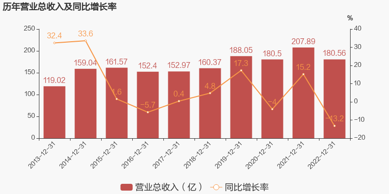 江河集团于2023年3月29日披露年报,公司2022年实现营业总收入180.56亿元,同比下降13.2%;实现归母净利润4.89亿元,上年同期为-10.1亿元,同比扭亏为盈;每股收益为0.43元。