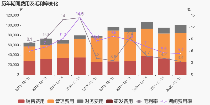 公司2022年营业成本181.72亿元,同比增长11.8%,高于营业收入10.9%的增速,导致毛利率下降0.8%。期间费用率为5.4%,同去年相比变化不大。