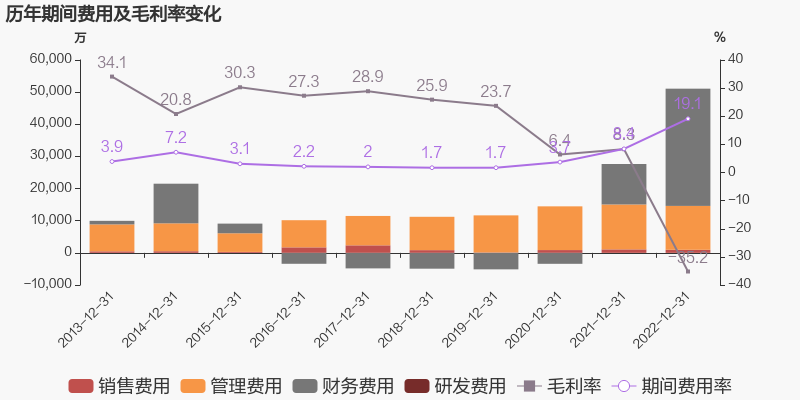 公司2022年营业成本36.11亿元,同比上升19.2%,营业收入同比下降19.2%,毛利率下降43.5%。期间费用率为19.1%,较上年升高10.8%。经营性现金流大幅下降69.4%至3.03亿元。