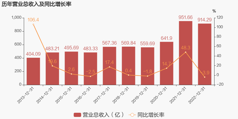 公司2022年营业成本883.52亿元,同比下降4.1%,高于营业收入3.9%的下降速度,毛利率上升0.1%。期间费用率为2.1%,同去年相比变化不大。经营性现金流由-33.15亿元增加至5.38亿元,同比上升116.2%。