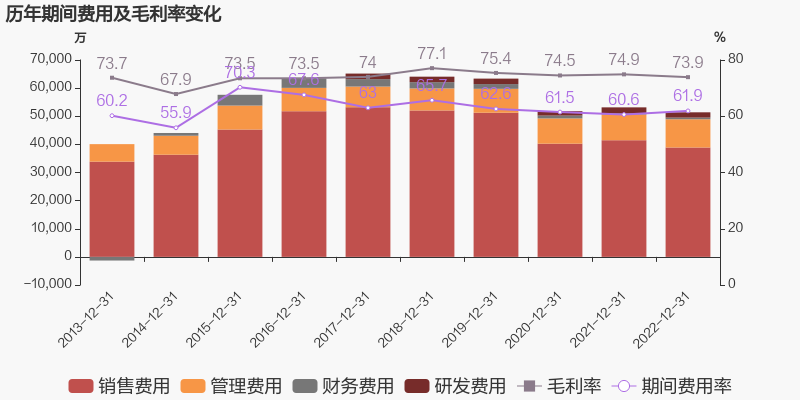 公司2022年营业成本2.17亿元,同比下降1.8%,低于营业收入5.5%的下降速度,毛利率下降1%。期间费用率为61.9%,较上年升高1.4%。