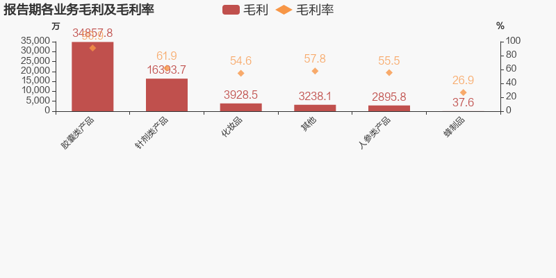 从业务结构来看,“胶囊类产品”是企业营业收入的主要来源。具体而言,“胶囊类产品”营业收入为3.84亿元,营收占比为46.2%,毛利率为90.9%。