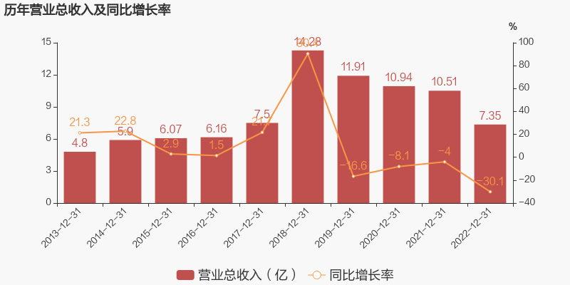 赛升药业于2023年3月30日披露年报,公司2022年实现营业总收入7.35亿元,同比下降30.1%,降幅较去年同期扩大;实现归母净利润2.05亿元,同比下降49.1%;每股收益为0.43元。