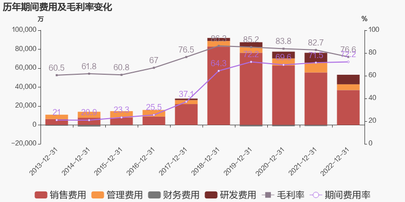公司2022年营业成本1.72亿元,同比下降5.8%,低于营业收入30.1%的下降速度,毛利率下降6%。期间费用率为72.2%,较上年升高0.7个百分点。