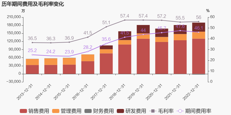 公司2022年营业成本17.89亿元,同比增长6.2%,低于营业收入7.5%的增速,导致毛利率上升0.5%。期间费用率为46.1%,较去年下降1.6%。