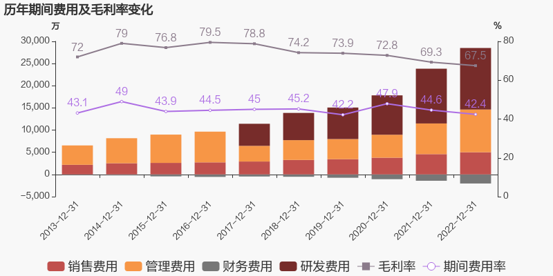 公司2022年营业成本2.03亿元,同比增长31.8%,高于营业收入24.2%的增速,导致毛利率下降1.9%。期间费用率为42.4%,较去年下降2.2%。