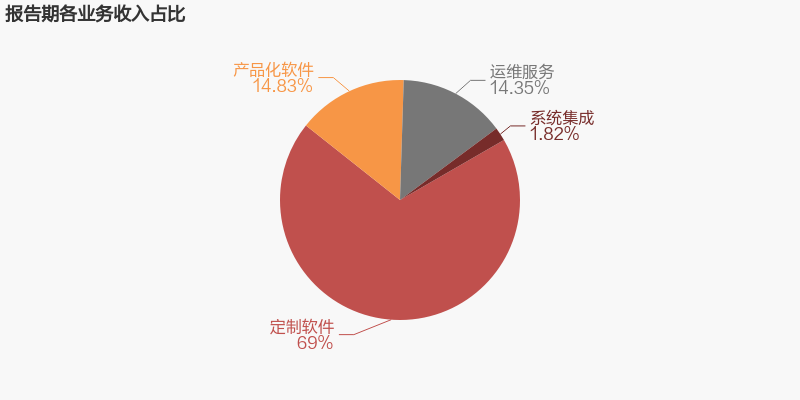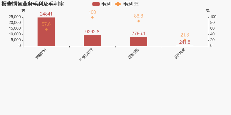 从业务结构来看,“定制软件”是企业营业收入的主要来源。具体而言,“定制软件”营业收入为4.31亿元,营收占比为69%,毛利率为57.6%。