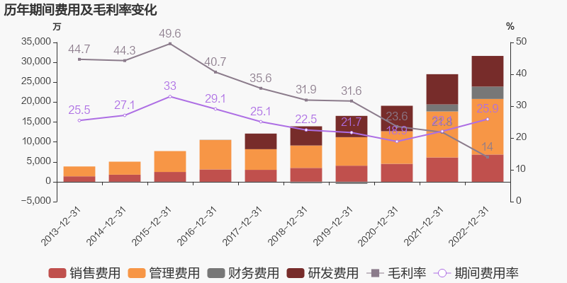 公司2022年营业成本10.52亿元,同比增长10.3%,高于营业收入0.2%的增速,导致毛利率下降7.8%。期间费用率为25.9%,较上年升高3.7%。