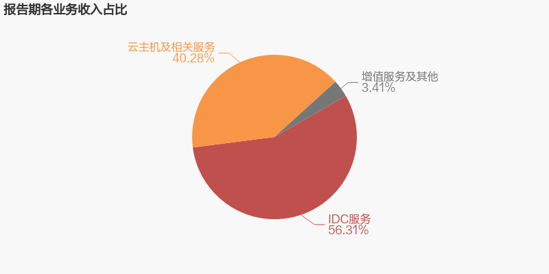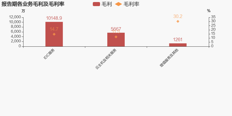 从业务结构来看,“IDC服务”是企业营业收入的主要来源。具体而言,“IDC服务”营业收入为6.89亿元,营收占比为56.3%,毛利率为14.7%。