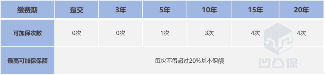 保单生效满3年后,每2年可申请无息加保一次,每次最高可增加20%基本保额,但仅限前10年可以申请,所以最多可以加保4次。