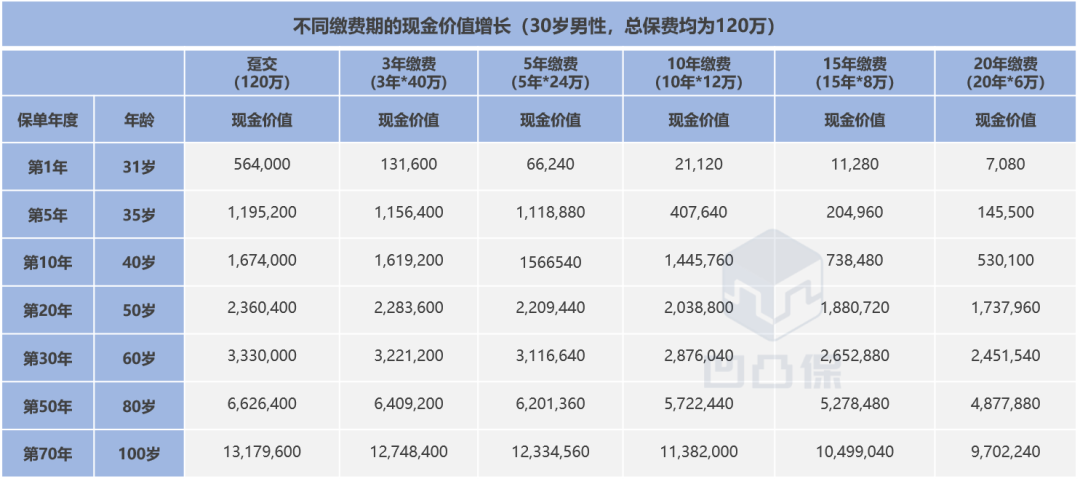 1、15年与20年缴费的前期现价较低,回归速度慢,虽然后期增速加快,但整体表现不如其他缴费期。