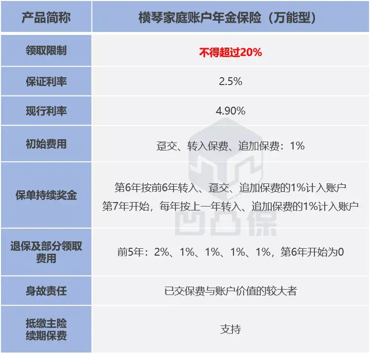 可关联的万能账户是闲钱保,全称是横琴家庭账户年金保险(万能型),属于年金型的万能账户,所以会有20%的领取限制,追加保费无上限,保底结算利率是2.5%,现行结算利率是4.90%。