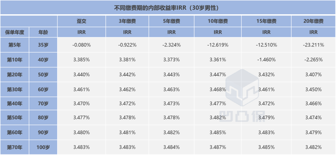 15年与20年的缴费期,前期现金价值较低,现金价值回归较慢,后期的现金价值的增速才加快,表现比较中规中矩。10年缴费期的表现最优秀,后期的内部收益率IRR接近3.49%。