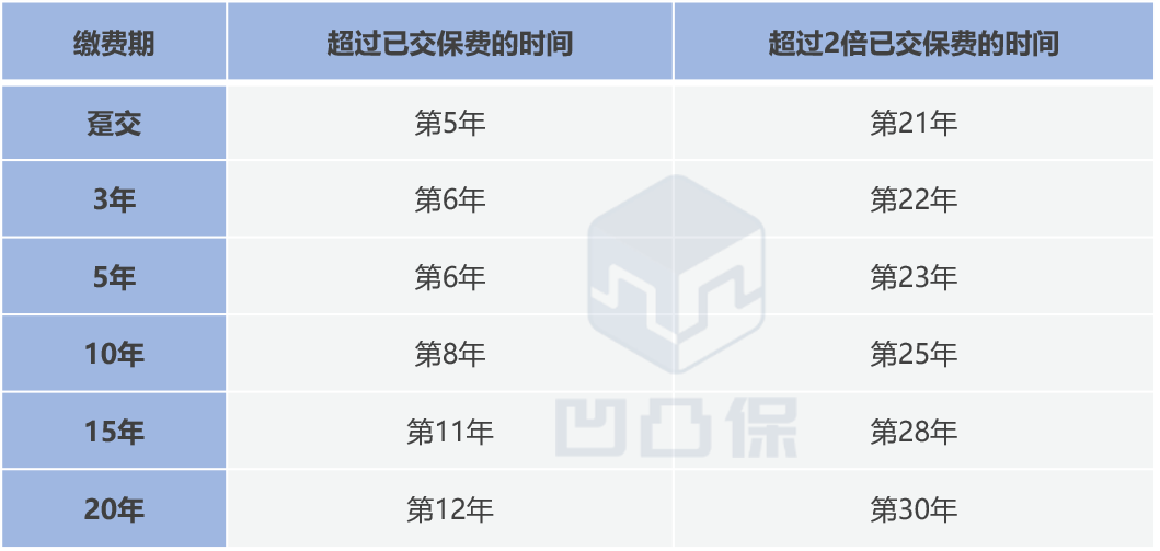 现金价值超过已交保费,以及超过2倍已交保费的时间: