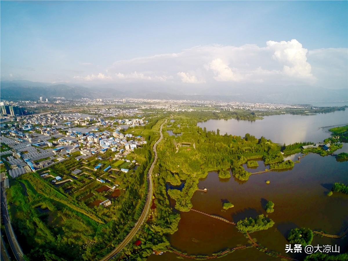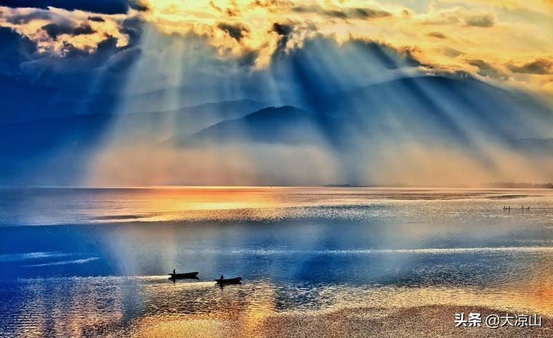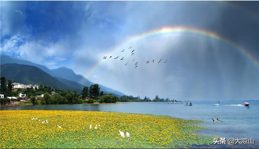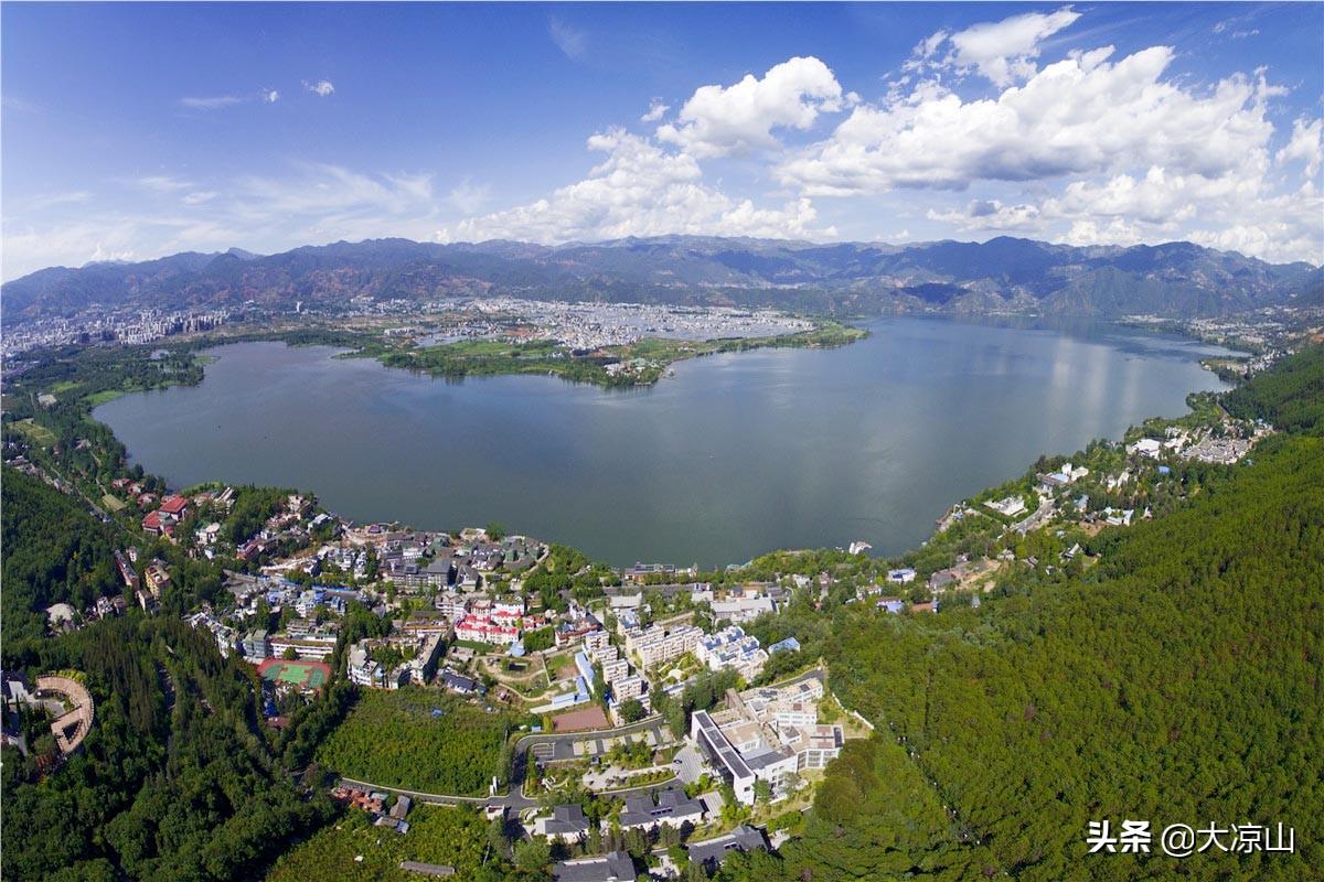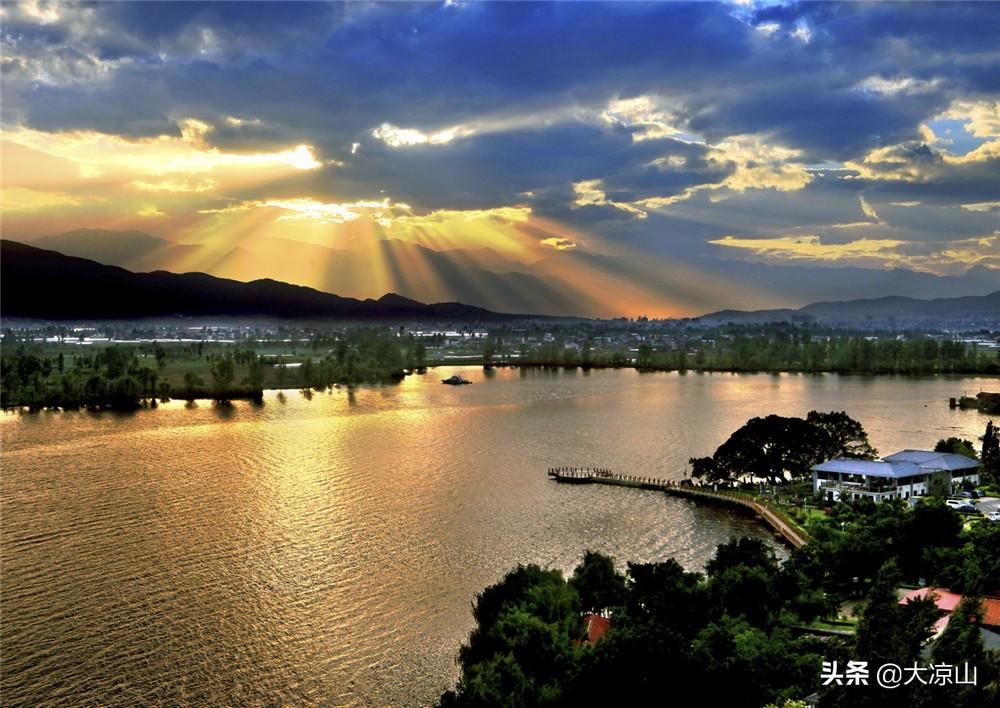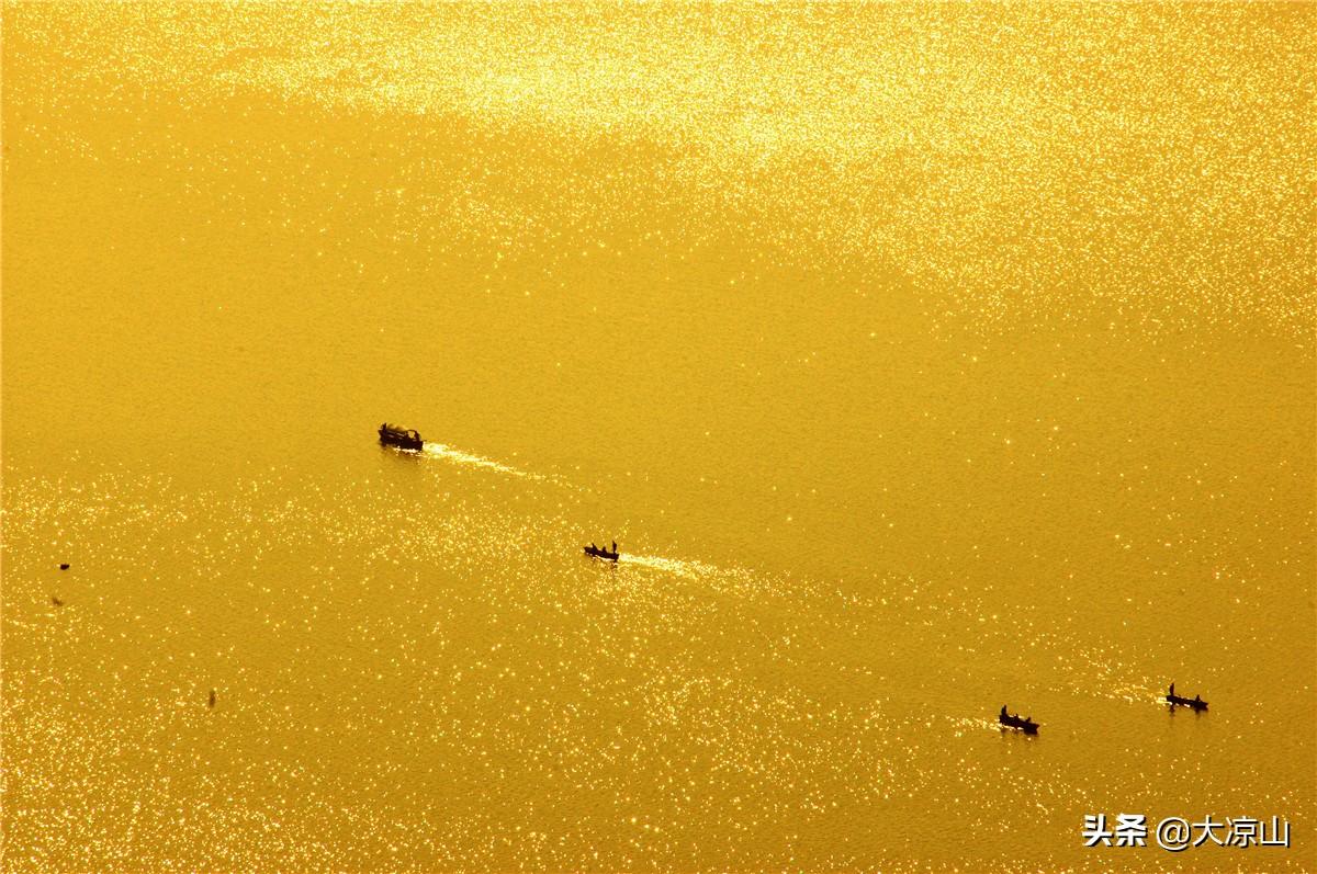 邛海碧波翻金浪,泸山绿涛夺眼帘。